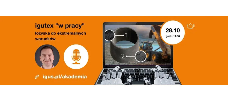 Dołącz do webinaru o bezobsługowych łożyskach ślizgowych igutex do heavy-duty. Włókno szklane + niskie tarcie powłoki = wytrzymałość bez smarowania. Idealne dla rolnictwa, budownictwa i górnictwa. Więcej opowie Michał Obrębski.