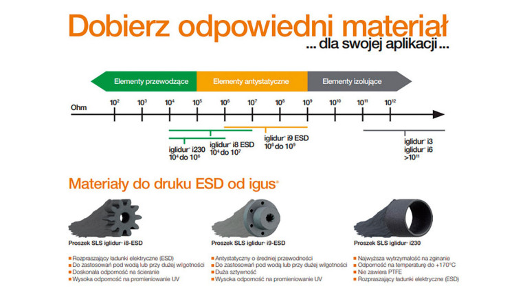 Firma igus oferuje specjalistyczne materiały do druku 3D metodą SLS, przeznaczone do aplikacji wymagających kontroli elektrostatycznej. Dwoma materiałami przeznaczonymi do tego są: iglidur i8-ESD oraz iglidur i9-ESD. Pierwszy z nich to materiał o bardzo niskiej rezystywności powierzchniowej, rekomendowany do najbardziej krytycznych zastosowań, gdzie absolutna ochrona przed wyładowaniami jest kluczowa. Drugi to tworzywo o wyższej sztywności i odporności mechanicznej, pozwalające na kompromis między bezpieczeństwem ESD a stabilnością wymiarową.