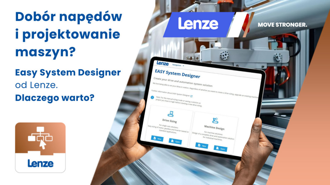 EASY System Designer to bezpłatne, niewymagające instalacji narzędzie, które wspiera w planowaniu, standaryzacji i integracji rozwiązań napędowych oraz automatyzacyjnych – od pierwszego doboru po przygotowanie struktury pod oprogramowanie PLC.