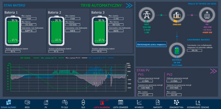 W ramach projektu wdrożono system zarządzania energią, który objął całą infrastrukturę elektroenergetyczną zakładu. EMS odpowiada za kompleksowe sterowanie i monitorowanie instalacji fotowoltaicznej o mocy 12 MWp, zajmującej powierzchnię 9,6 ha, wyposażonej w 32 falowniki i dwie stacje transformatorowe. Ponadto, system zarządza bateryjnym magazynem energii o mocy 7 MW i pojemności 14 MWh, który składa się z siedmiu kontenerów, 35 falowników oraz trzech stacji transformatorowych i rozdzielnic niskiego oraz średniego napięcia. Dzięki temu wszystkie elementy infrastruktury zostały zintegrowane w sposób umożliwiający efektywne zarządzanie przepływami energii elektrycznej między instalacją fotowoltaiczną, magazynem energii a zapotrzebowaniem zakładu, przy jednoczesnym utrzymaniu wymogu „zero export”. Oznacza to, że energia wytworzona na miejscu jest w pełni wykorzystywana lokalnie, bez sprzedaży nadmiaru do sieci energetycznej.