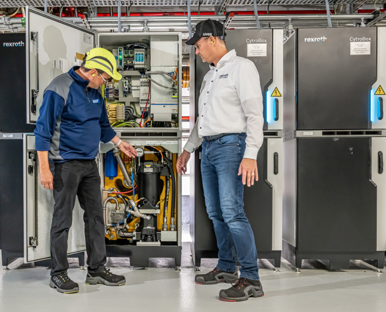 Rozwiązanie Bosch Rexroth obejmuje dziewięć kompaktowych, inteligentnych jednostek CytroBox połączonych w układzie master–slave, wspieranych przez moduły ABMAXX odpowiedzialne za filtrację i chłodzenie medium. Taka architektura pozwala elastycznie dostosować wydajność do bieżącego zapotrzebowania i zapewnia pełną przejrzystość pracy całego układu.