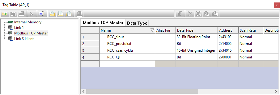 Po kliknięciu w element Tags, wyświetla się okno Tag Table, gdzie wybieramy łącze skonfigurowane do komunikacji Modbus (Modbus TCP Master).