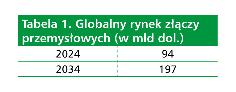 Wartość globalnego rynku złączy przemysłowych zwiększy się z prawie 94 mld dol. w 2024 r. do blisko 197 mld dol. w 2034 r., co oznacza umiarkowany średni wzrost co roku o ponad 7% (wg Zion Market Research). Napędzać go będą przede wszystkim: rosnące tempo automatyzacji i coraz powszechniejsze wykorzystanie złączy w wersji wzmocnionej w urządzeniach medycznych i w infrastrukturze sieci 5G. Głównymi segmentami tego rynku okażą się, ze względu na sposób podłączenia – złącza przemysłowe zaciskowe, a ze względu na typ – złącza okrągłe.