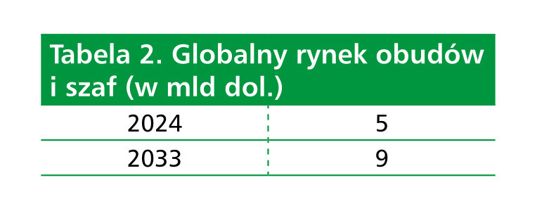 Z kolei wartość światowego rynku obudów i szaf przemysłowych zwiększy się z 5 mld dol. w 2024 r. do prawie 9 mld dol. w roku 2033, co oznacza stabilny średni wzrost o ponad 6% rocznie (wg Verified Market Research). Najbardziej sprzyjać mu będą: zaostrzanie przepisów bezpieczeństwa pracy, zwiększenie nacisku na zapewnienie trwałości urządzeń oraz dokonujący się postęp technologiczny w zakresie materiałów obudów. Obecnie najpopularniejsze są obudowy i szafy z aluminium oraz ze stali nierdzewnej, natomiast najszybciej rozwija się segment obudów z tworzyw sztucznych. Ich głównymi odbiorcami są energetyka, centra danych i przemysł. W okresie objętym prognozą najszybciej popyt na nie będzie rósł w centrach danych, napędzany cyfryzacją i popularyzacją chmury.