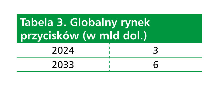 Wartość globalnego rynku przycisków zwiększy się z kolei z 3 mld dol. w 2024 r. do prawie 6 mld dol. w 2033 r., co oznaczać będzie wzrost o prawie 8% rocznie (wg Verified Market Research). Wywoła go przede wszystkim automatyzacja w różnych branżach oraz rosnący nacisk na bezpieczeństwo i wygodę użytkownika w zastosowaniach przemysłowych. Wyzwaniem okażą się zmienność cen materiałów, tworzyw sztucznych i metali, z których wykonuje się przyciski, a także rosnąca konkurencja ze strony alternatywnych technologii przełączania, takich jak ekrany dotykowe i sterowanie głosowe.