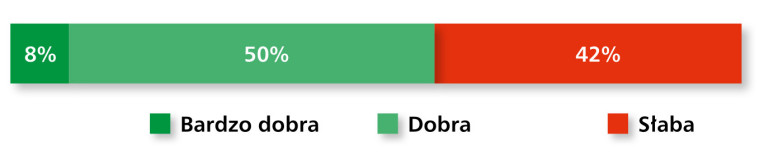 Przeprowadzone badanie wskazuje na zróżnicowany rozkład ocen dotyczących bieżącej sytuacji w branży obudów i szaf przemysłowych. Zaledwie 8% ankietowanych uznało sytuację za "bardzo dobrą". Połowa (50%) oceniła ją jako "dobrą", podczas gdy aż 42% respondentów wskazało na "słabą" kondycję sektora (rys. 1). Wyniki te, mniej korzystne niż w badaniach z poprzednich lat, odzwierciedlają wyzwania związane z rosnącymi kosztami działalności i presją inwestycyjną po stronie klientów.