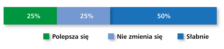 Jeszcze wyraźniej ostrożne nastroje widać w odpowiedziach dotyczących koniunktury. Połowa ankietowanych (50%) uznała, że sytuacja rynkowa słabnie, podczas gdy po 25% badanych wskazało na brak zmian lub poprawę (rys. 2). Rozkład ten sugeruje, że branża znajduje się obecnie w fazie spowolnienia, przy czym część dostawców sygnalizuje utrzymanie stabilnej pozycji, a tylko mniejszość dostrzega oznaki ożywienia.
