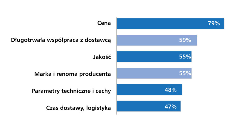 Analiza wyników pokazuje wyraźne przesunięcie akcentów. O ile cena zawsze była kryterium istotnym, o tyle dziś jej dominacja jest jeszcze bardziej widoczna. Z kolei jakość i parametry techniczne, które wcześniej znajdowały się wyżej w zestawieniu, obecnie ustępują miejsca relacjom handlowym oraz marce producenta. To potwierdza, że rynek funkcjonuje dziś w realiach silnej presji kosztowej, a decyzje zakupowe częściej niż kiedyś podporządkowane są ekonomii i przewidywalności współpracy.
