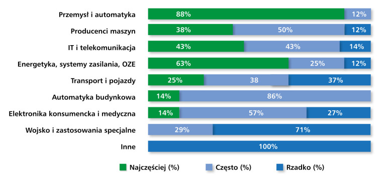 Wyniki wskazują na utrzymującą się przewagę przemysłu, automatyki i energetyki jako kluczowych obszarów zastosowań. W poprzedniej edycji badania wyraźniej akcentowano także budownictwo i automatykę budynkową, które dziś plasują się niżej, co może wynikać z osłabienia tempa inwestycji w tym segmencie. Jednocześnie większą rolę niż wcześniej zaczynają odgrywać transport oraz aplikacje w branży IT i telekomunikacji, co świadczy o stopniowym rozszerzaniu obszarów zastosowań i rosnącym znaczeniu cyfryzacji oraz nowych technologii w gospodarce.