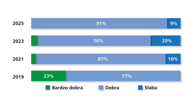 W tegorocznym badaniu redakcyjnym branża złączy silnoprądowych i heavy-duty została oceniona bardzo pozytywnie. Aż 91% respondentów uznało sytuację rynkową za "dobrą", natomiast jedynie 9% określiło ją jako "słabą". Co istotne, nikt nie ocenił jej jako "bardzo dobrą" (rys. 10), co może sugerować ostrożny optymizm i świadomość istniejących wyzwań.