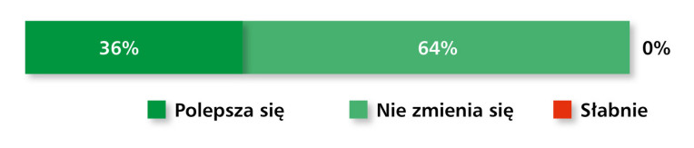 Oceny dotyczące koniunktury potwierdzają stabilizację – ponad połowa badanych (64%) uznała, że sytuacja nie ulega większym zmianom, a 36% zauważyło oznaki poprawy. Brak wskazań na pogorszenie (rys. 11) wskazuje, że rynek wchodzi w fazę równowagi, po wcześniejszych wahaniach związanych z koniunkturą przemysłową.