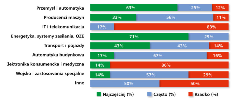 Inne obszary – takie jak automatyka budynkowa (głównie "często") czy wojsko i zastosowania specjalne – pojawiają się w wynikach w mniejszej skali, ale ich udział wskazuje na znaczenie niszowych aplikacji wymagających specjalistycznych rozwiązań. Z kolei IT i telekomunikacja oraz elektronika konsumencka i medyczna uzyskały marginalne wartości – odpowiednio 83% i 86% wskazań w kategorii "rzadko". Potwierdza to, że złącza silnoprądowe i heavy-duty nie są tam standardem.