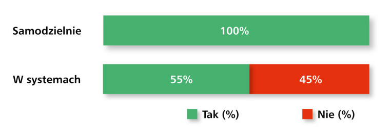 Złącza przemysłowe najczęściej trafiają na rynek jako samodzielne produkty – wszyscy respondenci wskazali tę formę sprzedaży (100%), co wskazuje, że podstawą obrotu pozostają indywidualne komponenty (rys. 18). Jednocześnie ponad połowa ankietowanych (55%) zadeklarowała, że złącza sprzedawane są również w ramach większych systemów i kompletacji, takich jak zestawy kabel– złącze, obudowa–złącze czy gotowe wiązki kablowe.