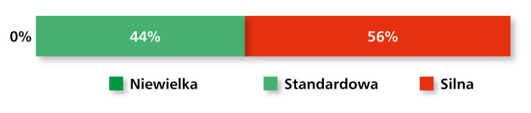 Jeśli chodzi o charakter konkurencji, dominuje postrzeganie jej jako "silnej" (56%) lub "standardowej" (44%), przy całkowitym braku wskazań na konkurencję niewielką (rys. 21). Branża pozostaje więc mocno nasycona, a dostawcy muszą rywalizować nie tylko ceną, lecz także zakresem oferty i innowacyjnością produktów.