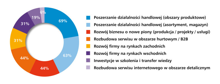 Respondenci badania podkreślają, że w najbliższych latach priorytetem firm dystrybucyjnych będzie umacnianie pozycji rynkowej poprzez rozwój oferty produktowej i poszerzanie zakresu działalności handlowej. Najczęściej wymieniano tu poszerzanie działalności w zakresie obszarów produktowych (69%) oraz rozszerzanie asortymentu i zwiększanie pojemności magazynów (63%) (rys. 10). Wyniki te potwierdzają, że dystrybutorzy koncentrują się na maksymalizacji dostępności towarów oraz kompleksowości oferty – czynnikach, które wprost przekładają się na lojalność klientów i udział w rynku.