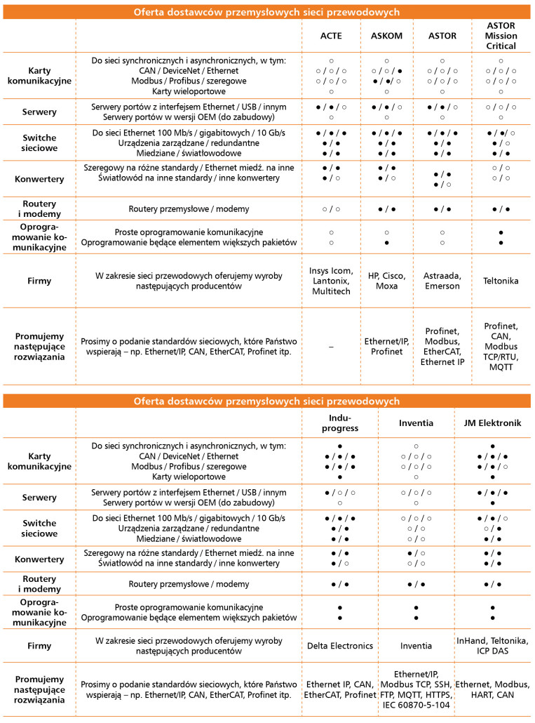 Rynek przemysłowych sieci komunikacyjnych w Polsce utrzymuje dobrą kondycję, charakteryzując się wysoką konkurencyjnością, rosnącą unifikacją standardów i stabilnym popytem na kluczowe urządzenia, szczególnie switche i routery. Najważniejsze technologie to wciąż GSM, Wi-Fi oraz rozwiązania ISM, przy czym równolegle rośnie znaczenie IoT, cyberbezpieczeństwa i nowych standardów Ethernetu. Perspektywiczne sektory, takie jak energetyka, infrastruktura i produkcja maszyn, będą w najbliższych latach napędzać dalszy rozwój rynku. Źródłem wszystkich danych przedstawionych w tabelach oraz na wykresach są wyniki uzyskane w badaniu ankietowym przeprowadzonym pod koniec października 2025 r. wśród krajowych producentów, dystrybutorów, integratorów oraz dostawców działających na polskim rynku przemysłowych sieci komunikacyjnych – zarówno przewodowych, jak i bezprzewodowych.