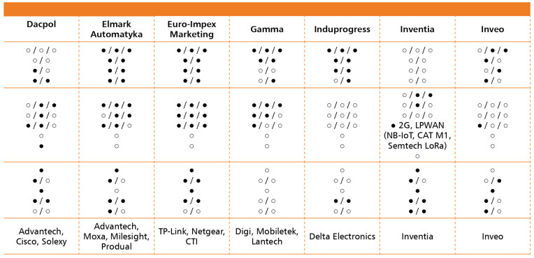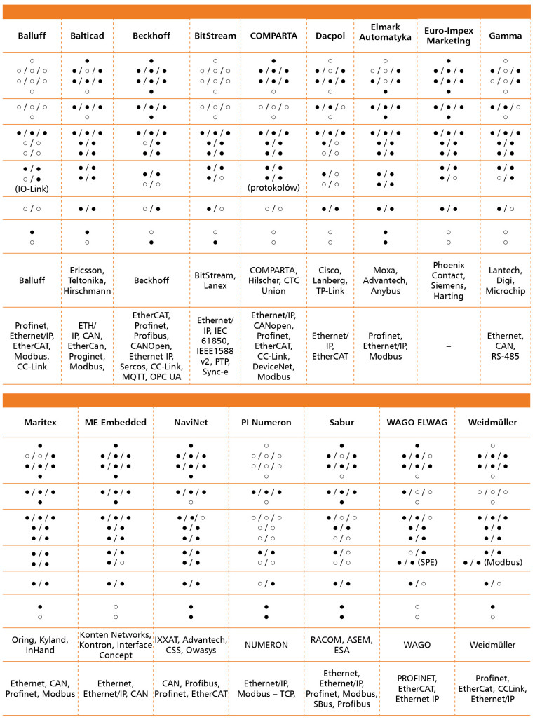 W odpowiedziach respondentów pojawiła się także duża grupa producentów, którzy uzyskali pojedyncze wskazania. Znalazły się wśród nich zarówno uznane marki specjalistyczne, w rodzaju Westermo, Harting czy Hilscher, jak również producenci urządzeń sieciowych znanych z sektora IT, tacy jak Netgear, Ubiquiti Networks, Juniper czy Dell. Obecność firm, takich jak Delta Electronics, AnyBus, Weidmüller, Insys Icom, Inventia, RACOM czy BitStream, potwierdza, że polski rynek charakteryzuje się dużą różnorodnością rozwiązań, obejmującą zarówno produkty do klasycznych instalacji przemysłowych, jak i urządzenia do zastosowań telemetrii, automatyki budynkowej czy infrastruktury krytycznej.