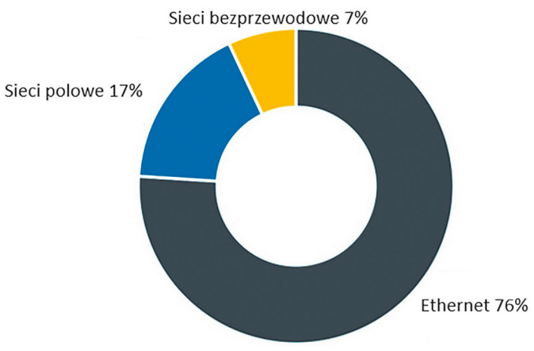 Sieci bezprzewodowe z kolei stanowiły 7% nowych węzłów. Ich udział utrzymał się zatem na tym samym poziomie w porównaniu z rokiem 2024. Łączność bezprzewodowa nadal stanowi przede wszystkim uzupełnienie przewodowej, zwłaszcza w zastosowaniach niewymagających komunikacji w czasie rzeczywistym, gdy ważna jest mobilność, elastyczność sieci oraz w miejscach, do których dostęp jest utrudniony. W przemyśle stopniowo na znaczeniu zyskuje technologia 5G. Pomimo ogromnego potencjału, jej wdrażanie niestety wciąż postępuje jednak wolno, głównie ze względu na wysokie koszty.
