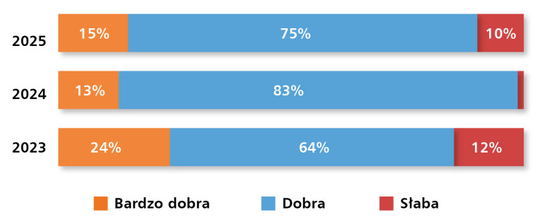 Wyniki badania przeprowadzonego pod koniec października 2025 r. wskazują na utrzymującą się bardzo dobrą kondycję krajowego rynku komunikacji przemysłowej. Aż 90% respondentów ocenia obecną sytuację na rynku jako „dobrą” lub „bardzo dobrą” (rys. 2). W porównaniu z poprzednią edycją badania wzrosły zarówno wskazania najwyższej oceny, którą wybrało 15% uczestników, jak i odpowiedzi „dobra”, notując obecnie 75%. Tak wysoki udział ocen pozytywnych potwierdza stabilną kondycję rynku. Odpowiedzi negatywne pozostają na niskim poziomie (10%), co sugeruje stabilne otoczenie inwestycyjne oraz ciągłe zapotrzebowanie na nowoczesne rozwiązania komunikacyjne w przemyśle.
