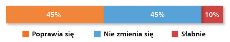 Opinie dotyczące kierunku zmian na rynku rozkładają się równomiernie (rys. 3). 45% ankietowanych dostrzega poprawę koniunktury, co potwierdza rosnącą aktywność inwestycyjną przedsiębiorstw modernizujących swoje systemy automatyki i infrastruktury komunikacyjnej. Taki sam odsetek respondentów uważa, że sytuacja pozostaje bez większych zmian, co może świadczyć o fazie stabilizacji po okresach dynamicznego wzrostu. Jedynie 10% uczestników badania zauważyło pogorszenie warunków rynkowych – wynik ten sugeruje, że ewentualne sygnały osłabienia mają raczej charakter lokalny i nie dotyczą całego sektora.