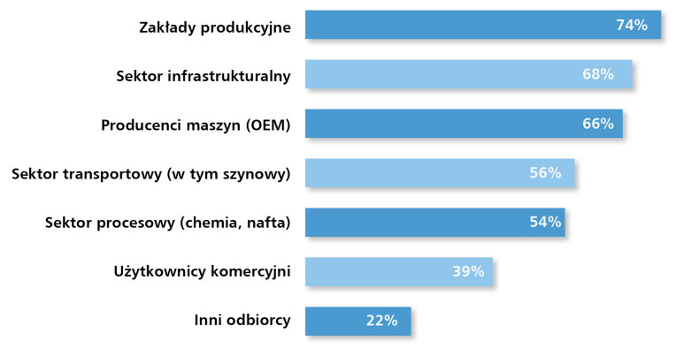 Największymi odbiorcami przemysłowych urządzeń sieciowych w Polsce pozostają zakłady produkcyjne, wskazane przez 74% respondentów (rys. 7). Wynik ten nie zaskakuje – segment produkcyjny jest najbardziej zaawansowany pod względem automatyzacji oraz najszybciej rozwija infrastrukturę OT/IT, co generuje stałe zapotrzebowanie na switche, routery, konwertery, moduły I/O i elementy redundancji sieciowej.