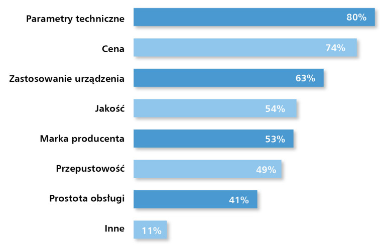 Drugim najczęściej wskazywanym kryterium jest cena (74%). Presja kosztowa w zakładach produkcyjnych, zwłaszcza w projektach modernizacyjnych, powoduje, że firmy szukają optymalnego stosunku kosztów do oferowanej funkcjonalności. Jednocześnie aż 63% respondentów podkreśla znaczenie „zastosowania urządzenia”, co wskazuje na silnie projektowy charakter rynku – dobór sprzętu musi odpowiadać konkretnej aplikacji, środowisku pracy i wymogom procesu technologicznego.