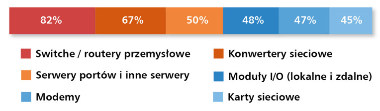 W dalszej kolejności zestawienia znajdują się modemy (47%), nadal chętnie stosowane w aplikacjach telemetrycznych, a także karty sieciowe (45%), które pozostają niezbędnym komponentem w integracji urządzeń przemysłowych z sieciami przewodowymi. Wysokie wskazania dla wszystkich kategorii potwierdzają, że rynek urządzeń komunikacyjnych pozostaje szeroki, zróżnicowany i stabilny, obejmując zarówno komponenty kluczowe dla nowych instalacji, jak i te niezbędne do modernizacji starszej infrastruktury.