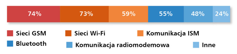 Wysoką pozycję utrzymuje także komunikacja w pasmach ISM (59%), obejmująca takie technologie, jak LoRaWAN, ZigBee oraz różne rozwiązania pracujące w zakresach 868 i 915 MHz. O jej znaczeniu decydują niskie koszty wdrożeń, dobra penetracja sygnału oraz możliwość obsługi dużych flot czujników IoT w trudnych warunkach środowiskowych. Na kolejnych miejscach znalazł się Bluetooth (55%), coraz częściej wykorzystywany w urządzeniach peryferyjnych, modułach pomiarowych, napędach i systemach monitoringu, oraz komunikacja radiomodemowa (48%), która mimo rozwoju sieci komórkowych nadal odgrywa ważną rolę w aplikacjach długodystansowych, szczególnie w energetyce i branżach infrastrukturalnych.