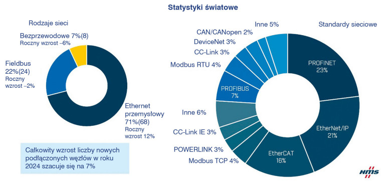 Według analiz HMS Networks globalny rynek sieci przemysłowych utrzymuje tempo wzrostu na poziomie ok. 7% rocznie. Dominującą pozycję zajmuje Ethernet przemysłowy, który odpowiada już za blisko 68% wszystkich instalacji. Tradycyjne sieci typu fieldbus utrzymują się na poziomie ok. 21%, a rozwiązania bezprzewodowe systematycznie zwiększają udział do 11%. W Polsce tendencje te są zbliżone – przedsiębiorstwa inwestują głównie w sieci Ethernet, rozbudowując infrastrukturę i wdrażając nowoczesne standardy komunikacji.