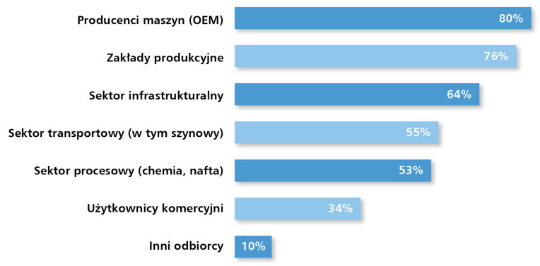 Najważniejszymi odbiorcami systemów sieciowych pozostają producenci maszyn (80%) i zakłady produkcyjne (71%). Coraz większe znaczenie mają również sektor energetyczny, transportowy i infrastrukturalny. Technologie komunikacyjne są kluczowym elementem modernizacji zakładów, integracji linii produkcyjnych oraz wdrażania systemów nadzoru i diagnostyki w czasie rzeczywistym. W wielu przypadkach sieci przemysłowe stanowią dziś podstawę systemów klasy SCADA i MES.