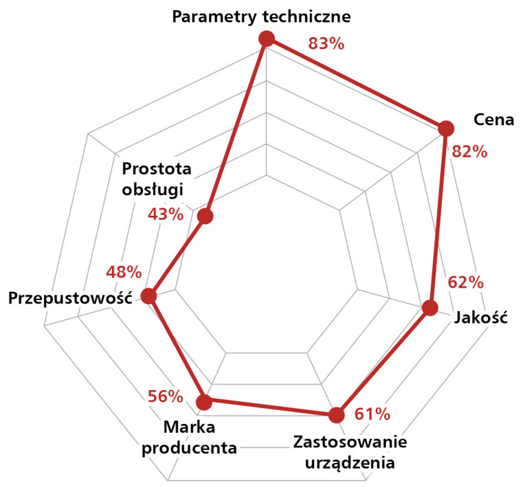 W nieco innym, bardziej szczegółowym układzie branż nasi respondenci stawiali prognozy co do najbardziej perspektywicznych branż z punktu widzenia zapotrzebowania na przemysłowe urządzenia sieciowe (rys. 6). Niezmiennie od lat najwięcej głosów pada na energetykę. W czołówce są ponadto przemysł maszynowy i produkcyjny, transport, intralogistyka i koleje. Odbiorcy w sektorze energetycznym stosują komponenty sieciowe w systemach SCADA (Supervisory Control and Data Acquisition) do monitorowania i sterowania pracą elektrowni oraz sieci przesyłowych. Wspólnym mianownikiem dla wszystkich branż wymienionych na rysunku 6 jest ich zapotrzebowanie na komponenty zapewniające wydajną komunikację przy gwarantowaniu niezawodnej pracy urządzeń w na ogół trudnych warunkach środowiskowych. Istnieją też szczególne potrzeby poszczególnych odbiorców, które zależą od specyfiki ich działań, skali operacji i wymagań technologicznych. Uniwersalne cechy produktowe, jak parametry, cena, jakość itp., w różnym stopniu determinują preferencje odbiorców przemysłowych urządzeń sieciowych. Jak pokazuje rysunek 7, najważniejsze są parametry techniczne i cena. Nieco niżej punktowane, ale bardzo istotne, są takie cechy jak: jakość, zastosowanie urządzenia, marka producenta, przepustowość i prostota obsługi.