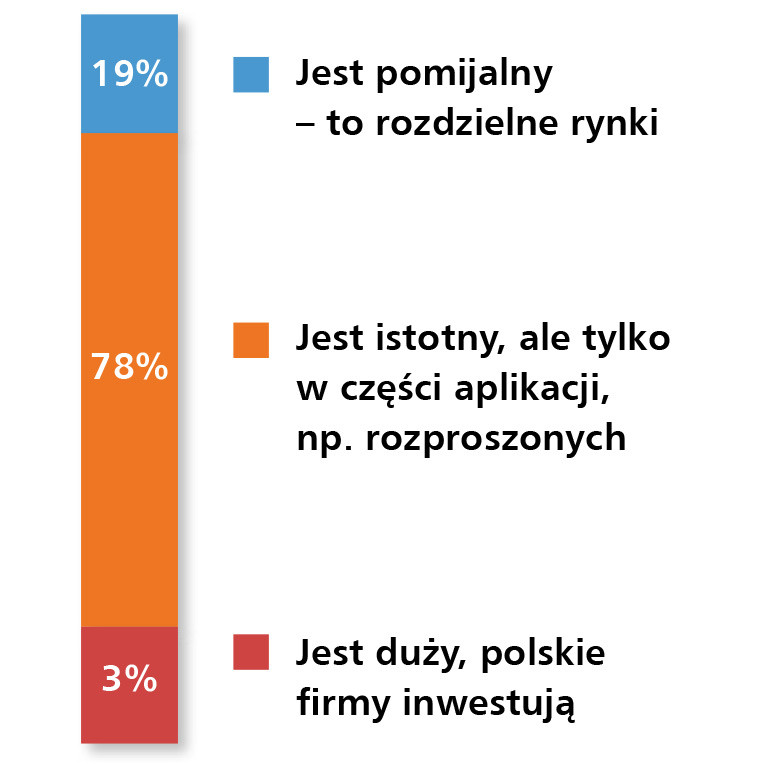 Dostawcy urządzeń sieciowych działają na rynku bardzo konkurencyjnym. W badaniach przed rokiem 57% respondentów ankiety uznawało tę branżę za silnie konkurencyjną. Obecnie było to 64% (rys. 8). Na pytanie o cenę wpływu rozwoju komunikacji bezprzewodowej w przemyśle na rynek sieci przewodowych (rys. 9) utrzymuje się opinia, że jest to wpływ istotny, ale tylko w części aplikacji, np. rozproszonych (78% odpowiedzi). Mimo rozwoju technologii bezprzewodowych ciągle dominuje komunikacja przewodowa. Z drugiej strony istnieje świadomość, że największe nowości technologiczne dotyczą komunikacji bezprzewodowej. Najczęściej wskazywano na technologię 5G (transmisja 5G/Industrial 5G) oraz Wi- Fi w trudnych warunkach środowiskowych.