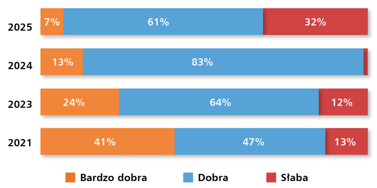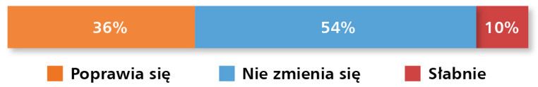 Pogorszyły się w ostatnim roku oceny sytuacji na krajowym rynku dystrybucji przemysłowych urządzeń sieciowych (rys. 10). Przed rokiem odpowiedź „słaba” wybrało zaledwie 4% respondentów. W bieżącym badaniu liczba tych ocen wzrosła do 32%. Spadła liczba ocen „bardzo dobra”, z 13 do 7%. Również oceny „dobra” w tym badaniu wystawiło 61% ankietowanych, podczas gdy przed rokiem było to 83%. Pocieszające są jednak oceny tendencji w zakresie koniunktury na omawianym rynku. Optymistów jest więcej niż pesymistów (rys. 11). Odpowiedź „poprawia się” wybrało 36% respondentów, a 10% uważa, że koniunktura słabnie.