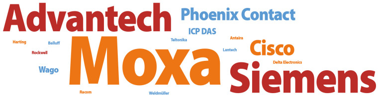 Rysunek 13 przedstawia w postaci chmury najpopularniejsze, zdaniem dystrybutorów, marki przemysłowych urządzeń sieciowych (przewodowych) sprzedawanych w Polsce. W porównaniu z badaniem sprzed roku utrzymuje się na pierwszym miejscu Moxa, a czołówkę stanowią poza tym: Siemens, Advantech, Cisco i Phoenix Contact.