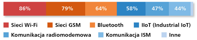 Jak pisaliśmy na początku tego raportu, udział technologii bezprzewodowych wynosi zaledwie 7%, ale ich znaczenie i akceptacja w zastosowaniach fabrycznych systematycznie rosną. Typowe zastosowania obejmują wymianę kabli, bezprzewodowy dostęp do maszyn i łączność z mobilnym sprzętem przemysłowym. Fantastyczne perspektywy rozwoju rysują się dla technologii Industrial IoT.