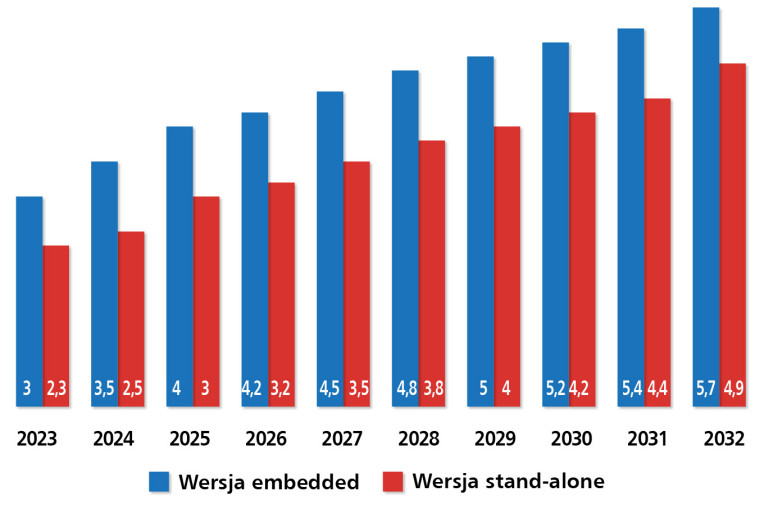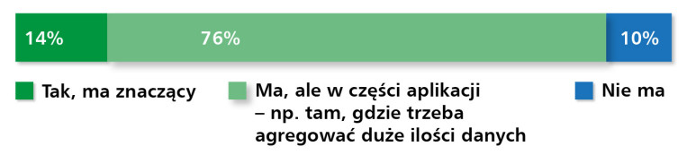 Nieodłącznym elementem rynku sterowników PLC jest rywalizacja z innymi technologiami automatyzacji, wśród których znaczącą rolę odgrywają komputery przemysłowe (IPC). Według wyników ankiety, 14% respondentów uważa, że rozwój IPC ma znaczący wpływ na rynek PLC, podczas gdy 76% wskazuje, że ich rola jest istotna jedynie w wybranych aplikacjach, takich jak agregacja i przetwarzanie dużych ilości danych (rys. 7). Jednocześnie 10% badanych nie dostrzega ich wpływu na rynek sterowników. Wyniki te sugerują, że komputery przemysłowe pełnią przede wszystkim funkcję uzupełniającą wobec klasycznych PLC, zamiast je całkowicie zastępować.