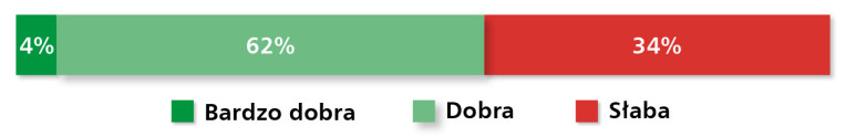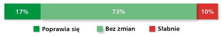 W porównaniu z wcześniejszymi edycjami raportu można zaobserwować lekkie pogorszenie nastrojów, jednak sektor wciąż utrzymuje się na relatywnie wysokim poziomie. Jeśli chodzi o ocenę koniunktury, większość respondentów – 73% – uważa, że pozostaje ona bez zmian. Natomiast 17% dostrzega poprawę, a 10% sygnalizuje jej pogorszenie (rys. 4). Wyniki te wskazują, że rynek nie wykazuje znaczących wahań, choć niewielka część uczestników badania dostrzega oznaki wzrostu. Wciąż jednak nie można mówić o wyraźnej tendencji wzrostowej lub spadkowej – branża znajduje się w fazie stabilizacji.
