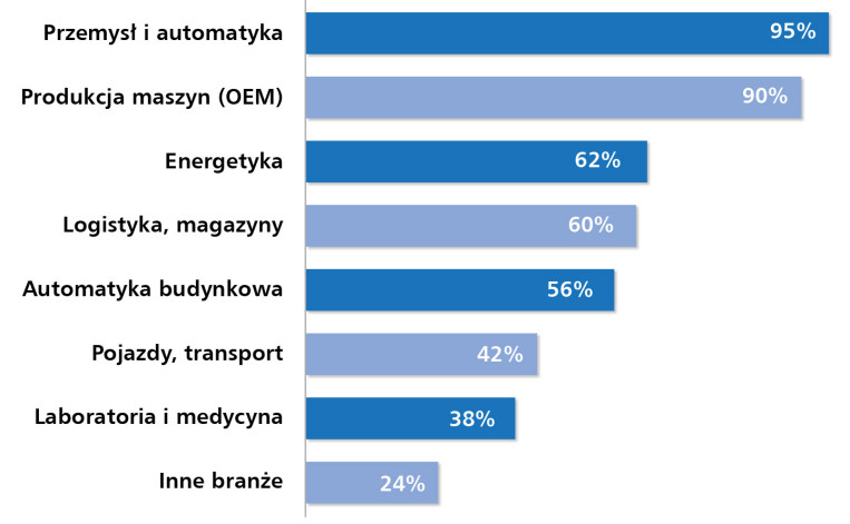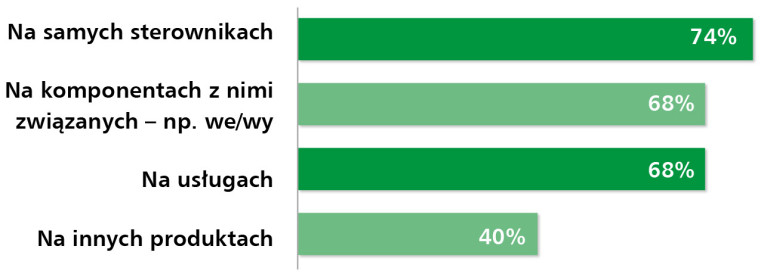 Produkcja maszyn (OEM) to kolejny istotny obszar zastosowania, wymieniony przez 90% uczestników badania. Sterowniki zapewniają precyzyjne zarządzanie pracą urządzeń, umożliwiają elastyczną konfigurację oraz integrację z nowoczesnymi systemami automatyki. Rosnące zapotrzebowanie na maszyny o wysokim stopniu automatyzacji, zdolne do pracy w inteligentnych fabrykach, przekłada się na coraz większe znaczenie tych technologii.