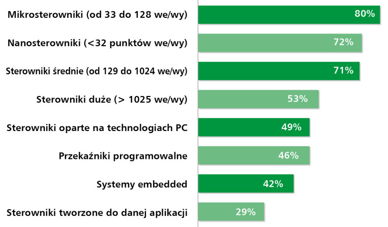 Na drugim miejscu znalazły się nanosterowniki (1025 we/wy), przeznaczone do rozbudowanych systemów sterowania w dużych instalacjach, zostały wymienione przez 53% respondentów. Tego typu urządzenia są stosowane m.in. w liniach produkcyjnych, instalacjach procesowych i infrastrukturze krytycznej, gdzie priorytetem są niezawodność oraz skalowalność.