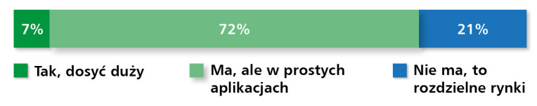 Podobna sytuacja występuje w przypadku przekaźników programowalnych. 72% respondentów wskazało, że mają one znaczenie głównie w prostych aplikacjach, natomiast tylko 7% uznało ich wpływ na rynek PLC za istotny (rys. 8). 21% badanych jest zdania, że przekaźniki programowalne i PLC to osobne segmenty rynku, które nie konkurują bezpośrednio ze sobą.