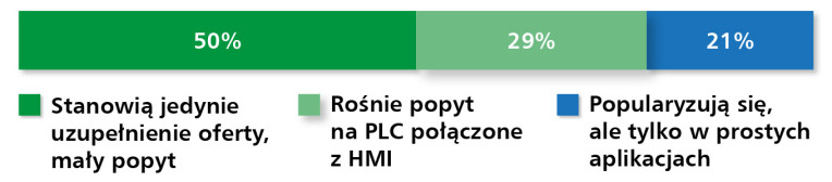 Jednym z istotnych trendów rynkowych jest integracja sterowników PLC z panelami operatorskimi HMI. Urządzenia te pozwalają na tworzenie kompaktowych systemów sterowania, szczególnie w prostych aplikacjach maszynowych. Jednak ich znaczenie wciąż pozostaje ograniczone – 50% uczestników badania uznało je za uzupełnienie oferty, które nie cieszy się dużym popytem (rys. 9). 29% zauważa rosnące zainteresowanie PLC połączonymi z HMI, a 21% dostrzega ich popularyzację, ale wyłącznie w mniej złożonych aplikacjach. Oznacza to, że choć integracja PLC z panelami operatorskimi ma swoje zalety, to klasyczne rozwiązania, w których sterownik i interfejs użytkownika są oddzielnymi jednostkami, nadal dominują na rynku.