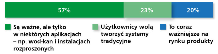 Coraz większe znaczenie zyskuje również integracja PLC z modułami GSM, zwłaszcza w aplikacjach wymagających zdalnej komunikacji. 57% ankietowanych wskazało, że sterowniki z wbudowaną transmisją GSM są istotne w specyficznych sektorach, takich jak gospodarka wodno-kanalizacyjna oraz systemy rozproszone (rys. 10). 20% respondentów zauważa ich rosnącą rolę w automatyce, chociaż na razie pozostają one technologią stosowaną głównie w specyficznych aplikacjach. Jednocześnie 23% uczestników badania deklaruje, że wciąż preferuje tradycyjne rozwiązania sterowania, co sugeruje, że technologie GSM nie są jeszcze powszechnym standardem w przemyśle.