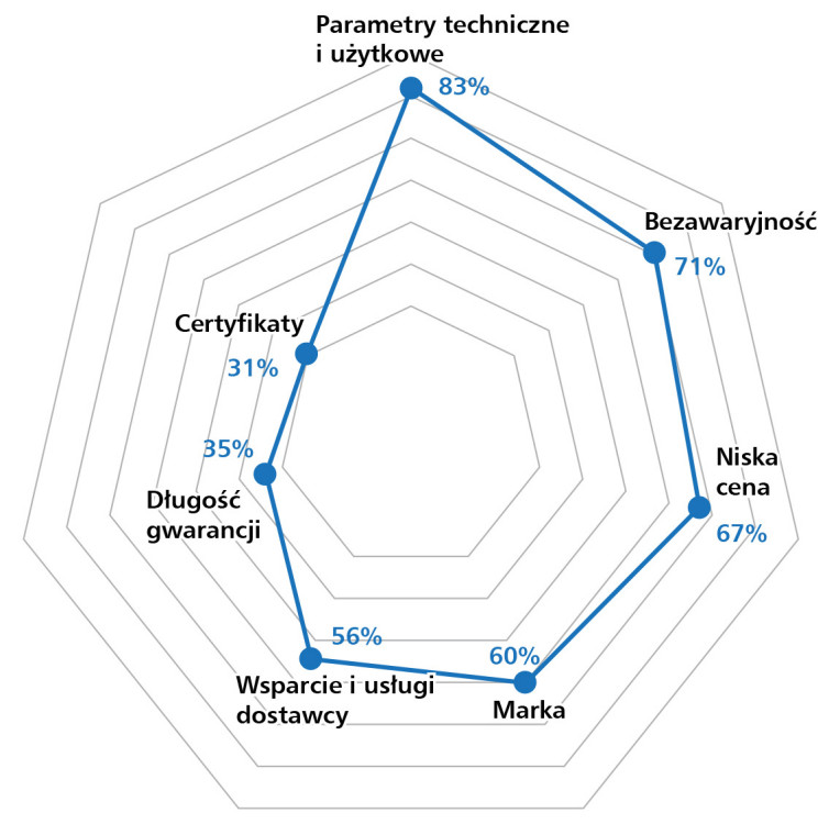 Klienci wybierający sterowniki PLC i kontrolery PAC kierują się przede wszystkim ich parametrami technicznymi i użytkowymi – ten aspekt został wskazany jako najważniejszy przez 83% respondentów (rys. 14). Największe znaczenie mają funkcjonalność, wydajność oraz możliwość rozbudowy urządzeń, które wpływają na efektywność systemów sterowania. Na drugim miejscu znalazła się bezawaryjność, wskazana przez 71% uczestników badania. Długoterminowa niezawodność jest szczególnie istotna w sektorach, gdzie przestoje maszyn generują wysokie koszty operacyjne. Cena zakupu, choć nie zawsze decydująca, pozostaje istotnym czynnikiem dla 67% badanych. Ma to szczególne znaczenie dla mniejszych firm oraz przedsiębiorstw wdrażających rozbudowane systemy sterowania, które muszą równoważyć koszty inwestycji z wymaganiami technicznymi. Marka producenta również ma duże znaczenie – 60% respondentów bierze ją pod uwagę przy wyborze urządzenia. Często wynika to z wcześniejszych doświadczeń użytkowników oraz dostępności wsparcia technicznego i oprogramowania. Kolejne istotne aspekty to jakość obsługi i usług dostawcy (56%), długość gwarancji (35%) oraz certyfikaty potwierdzające zgodność z normami (31%). Wyniki te pokazują, że klienci oczekują nie tylko nowoczesnych technologii, ale także niezawodnego wsparcia i pewności, że sprzęt spełnia wymagania branżowe.