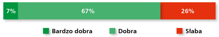 Segment przetworników położenia i silników krokowych wciąż utrzymuje się w strukturze rynku automatyki jako specjalistyczna, choć coraz istotniejsza gałąź. W opinii 67% ankietowanych sytuacja na rynku jest dobra, a kolejne 7% ocenia ją jako bardzo dobrą – co sugeruje umiarkowanie pozytywne nastroje w branży (rys. 22). Z drugiej strony, aż 26% ankietowanych wskazało, że sytuacja na rynku jest słaba – co okazuje się wynikiem wyższym niż w przypadku innych grup produktów omawianych w raporcie i może świadczyć o rosnącej presji konkurencyjnej oraz ograniczonej dynamice nowych wdrożeń.