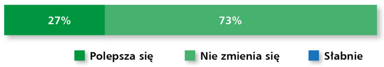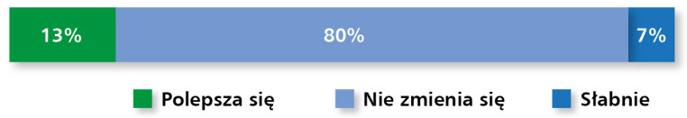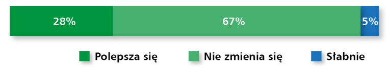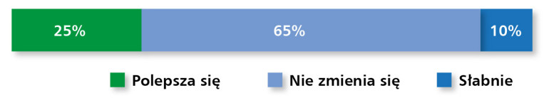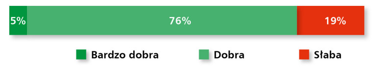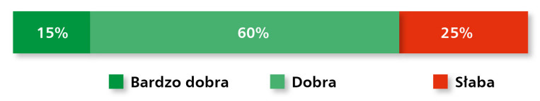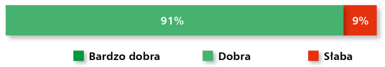 Rynek elementów wykonawczych – obejmujący pneumatykę, hydraulikę siłową i elektryczne napędy liniowe – utrzymuje się na stabilnym poziomie, pomimo ograniczonej dynamiki rozwoju. Aż 91% respondentów uznało aktualną sytuację w branży za dobrą, choć nikt nie ocenił jej jako bardzo dobrej, co może świadczyć o pewnym nasyceniu rynku lub wyhamowaniu inwestycji w niektórych sektorach (rys. 15). Z kolei tylko 9% uczestników badania dostrzega oznaki osłabienia – co, biorąc pod uwagę zróżnicowany charakter aplikacji tych komponentów, jest sygnałem umiarkowanego optymizmu.