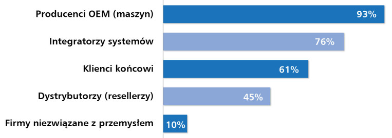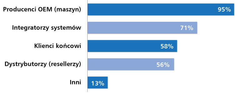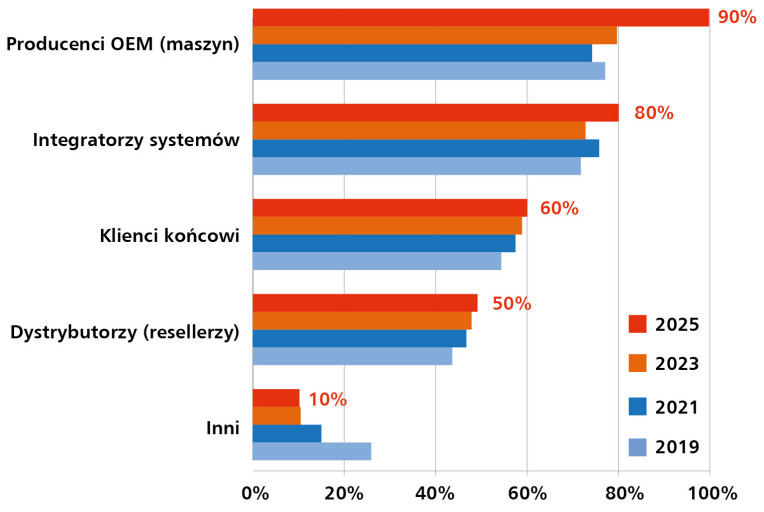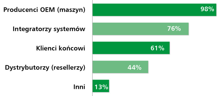 Użytkownicy końcowi (58%) stosują te rozwiązania głównie w zakładach produkcyjnych i laboratoriach, gdzie liczy się trwałość, możliwość szybkiego serwisu oraz kompatybilność z już działającymi systemami. Z kolei dystrybutorzy (56%) odpowiadają za dużą część sprzedaży – ich obecność odzwierciedla znaczenie kanałów pośrednich, które obsługują klientów z sektora MŚP, serwisu i edukacji, gdzie kluczowe są dostępność i szybka reakcja.