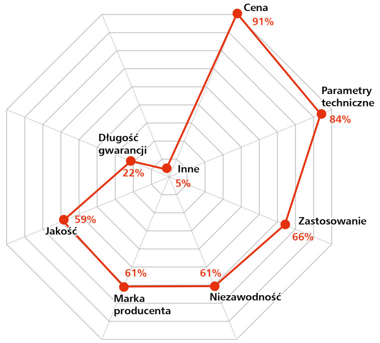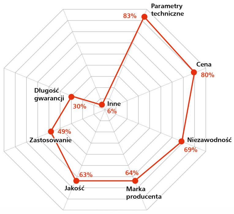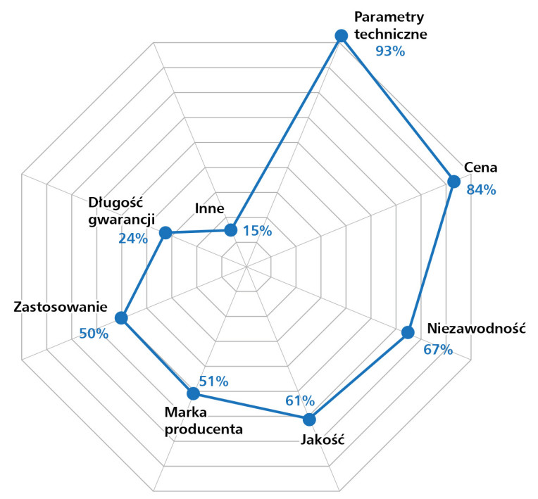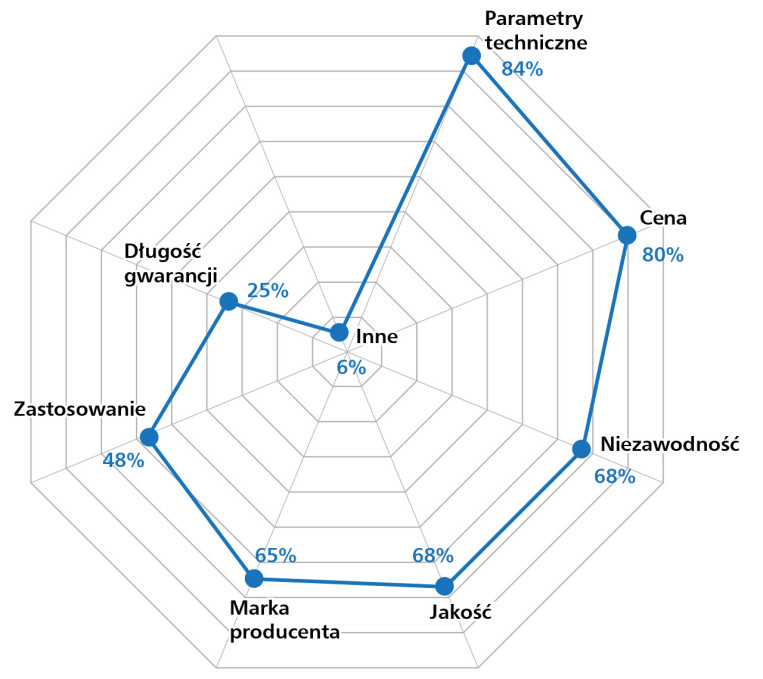 Zaskakiwać może relatywnie wysoka pozycja marki producenta (51%) oraz zastosowania jako czynnika decyzyjnego (50%) – co sugeruje, że odbiorcy poszukują rozwiązań „projektowanych z myślą o aplikacji”, a nie uniwersalnych, masowych produktów. Rozpoznawalność marki pełni tu funkcję nie tylko wizerunkową, ale również gwarancyjną i inżynierską – kojarzy się z kompatybilnością, dokumentacją techniczną i wsparciem wdrożeniowym.