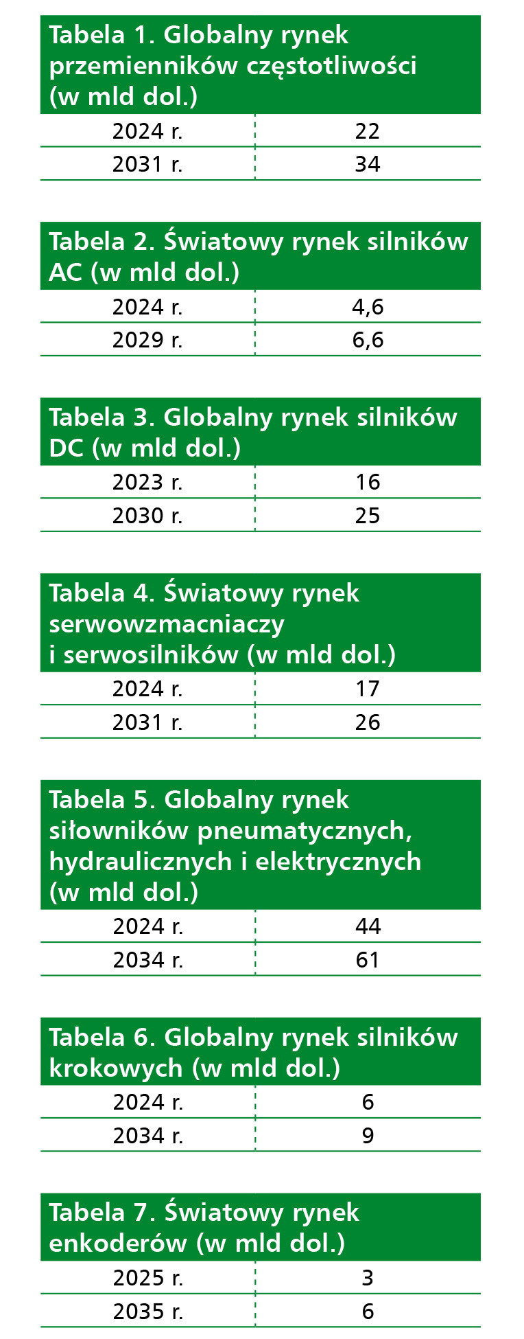 Serwowzmacniacze (serwonapędy) i serwosilniki to z kolei elementy systemów sterowania ruchem, pracujące w zamkniętej pętli sprzężenia zwrotnego, które umożliwiają precyzyjne, powtarzalne i szybkie pozycjonowanie i kontrolę prędkości i momentu obrotowego. Wykorzystuje się je m.in. w robotach i różnego typu maszynach, jak pakowarki i obrabiarki. Popyt na nie rośnie. Przyczyniają się do tego: automatyzacja produkcji, rozwój technologiczny, np. wprowadzenie robotów współpracujących, rozwój energetyki odnawialnej i samochodów elektrycznych. Główne wyzwania to: wysokie koszty zakupu i konserwacji, złożona i wymagająca specjalistycznej wiedzy integracja z istniejącymi systemami, konkurencja ze strony tańszych alternatyw, takich jak silniki krokowe. W rezultacie wartość światowego rynku serwonapędów i serwosilników zwiększy się z blisko 17 mld dol. w roku 2024 do prawie 26 mld dol. w 2031 r., co oznaczać będzie trwały wzrost średnio rocznie o 6% (wg Verified Market Research).