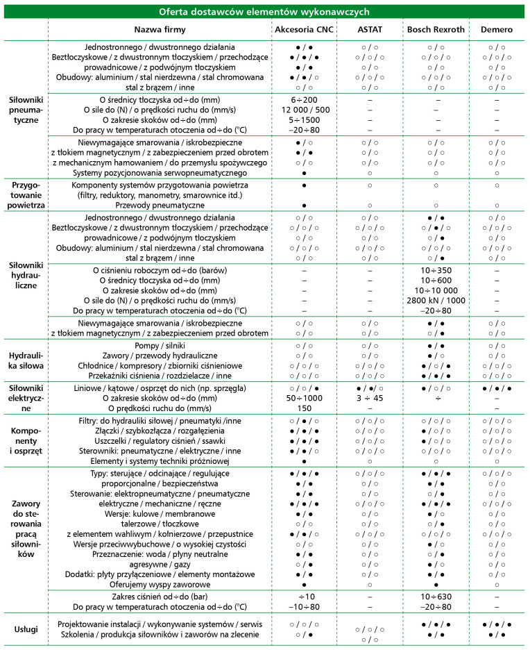 Segment elementów wykonawczych obejmuje siłowniki pneumatyczne i hydrauliczne, zawory, kompresory, siłowniki elektryczne i komponenty napędów liniowych. 91% uczestników badania oceniło sytuację w tej części rynku jako dobrą lub bardzo dobrą. Najczęściej wymieniani dostawcy to: Festo, SMC, Parker, Metal Work, Bosch Rexroth i Schneider Electric. Pneumatyka pozostaje preferowaną technologią dla aplikacji o dużej prędkości i prostych cyklach roboczych, natomiast napędy elektryczne zyskują udział w obszarach wymagających precyzyjnej regulacji siły i położenia. Nowoczesne zawory i siłowniki wyposażane są w czujniki pozycji, interfejsy IO-Link i funkcje autodiagnostyczne.