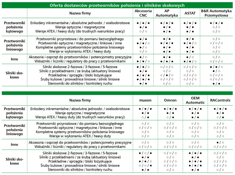 Czwarty segment rynku obejmuje enkodery, przetworniki liniowe i kątowe oraz silniki krokowe stosowane w systemach pozycjonowania. W 2025 r. 57% firm oceniło koniunkturę w tym obszarze jako stabilną, a 30% – jako poprawiającą się. Najważniejsi dostawcy to: Kübler, Sick, Moons, Heidenhain, Festo i Nanotec. Wzrasta udział czujników z komunikacją SSI, IO-Link, EtherCAT oraz rozwiązań magnetycznych o zwiększonej odporności EMC. Zastosowania obejmują automatyzację montażu, maszyny drukujące i stoły pomiarowe.